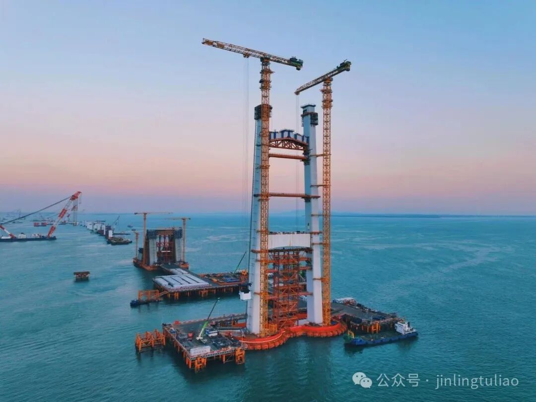 廈金大橋(廈門段)全長約19.62公里,其中劉五店航道橋作為核心控制性工程,主跨達(dá)928米,索塔高178.1米,是福建省內(nèi)最大跨徑的離岸式海中懸索橋。此次封頂?shù)臇|、西主塔,其防撞鋼套箱更是創(chuàng)下國內(nèi)紀(jì)錄——呈啞鈴狀的雙壁鋼套箱總長105.8米、總寬47米,總平面面積達(dá)3842平方米,相當(dāng)于9個(gè)標(biāo)準(zhǔn)籃球場(chǎng)大小,總重量超4200噸,規(guī)模遠(yuǎn)超港珠澳大橋同類構(gòu)件。