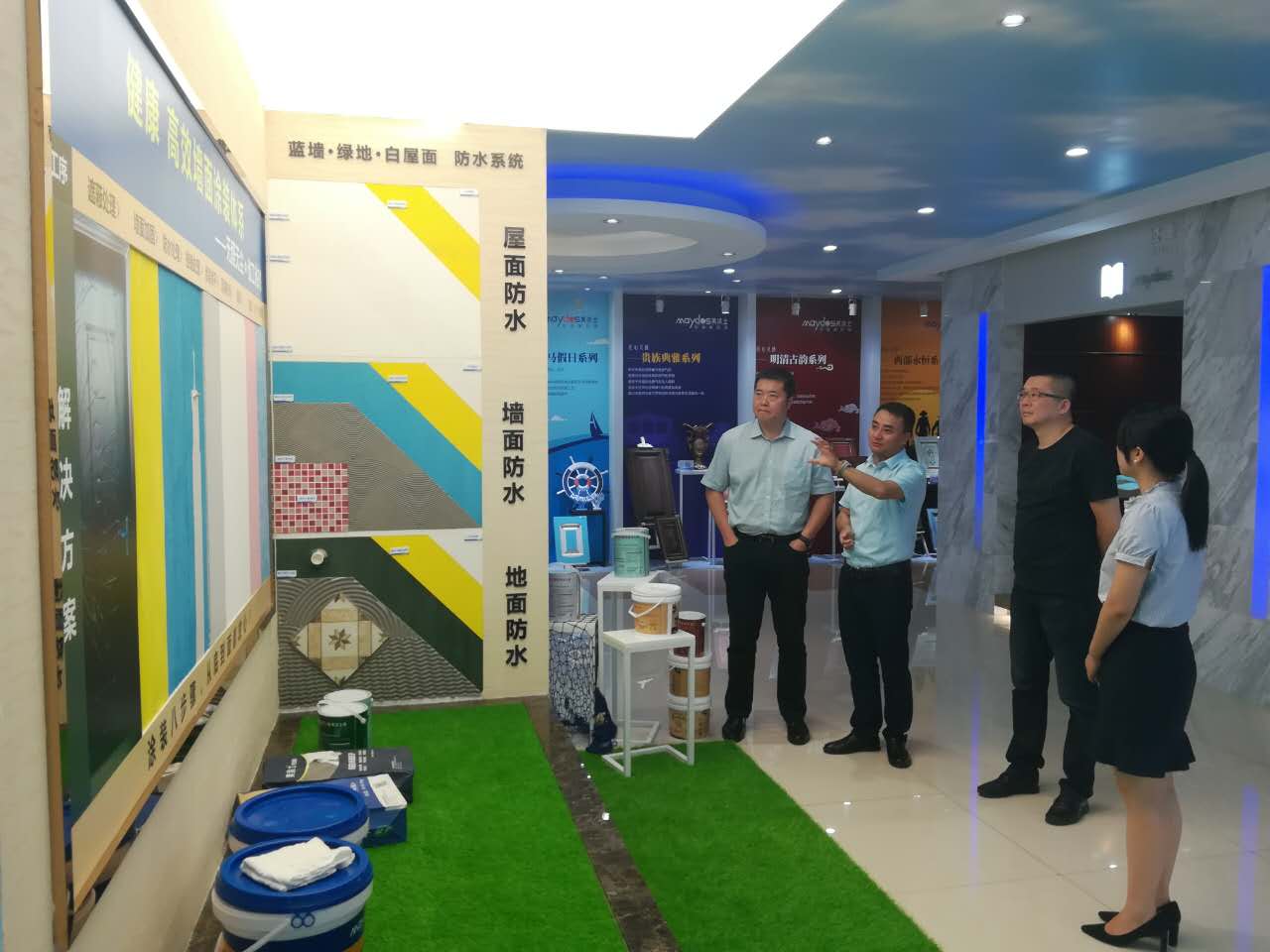 楊總為謝會長與王輝秘書長介紹了企業(yè)發(fā)展?fàn)顩r與歷史,并對美涂士與家裝企業(yè)合作的案例與模式進行了講解。