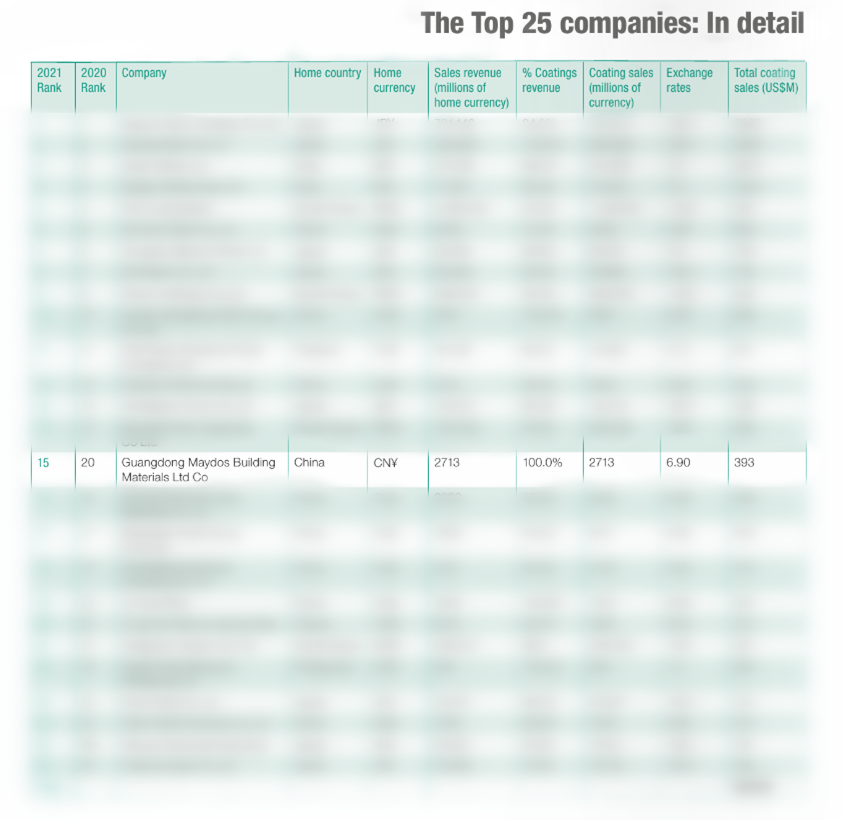 ? 在過去一年中,亞太地區(qū)前25名涂料制造商名單中的每家公司顯然都會(huì)受到新冠肺炎疫情的影響,但美涂士攻堅(jiān)克難,在此次排名中也上升了5位!