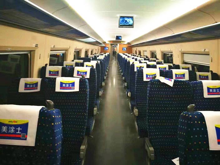 不僅僅只是在高鐵車廂的座椅頭枕上,在京廣深段高鐵沿線主要城市,美涂士亦投放了高鐵站內(nèi)LED大屏廣告與站臺動態(tài)燈箱廣告。除此之外,美涂士還斥重金在京廣深路線列車以及滬漢蓉線《火車》雜志上打造美涂士品牌形象;覆蓋廣東、湖南、湖北、河南、河北、北京、遼寧、福建、黑龍江等多個省份城市運行區(qū)間的高鐵列車,將美涂士崇尚健康安心的生活方式和打造環(huán)保涂料的理念傳達(dá)給數(shù)以億計的乘客,共同見證美涂士雄厚的品牌實力。