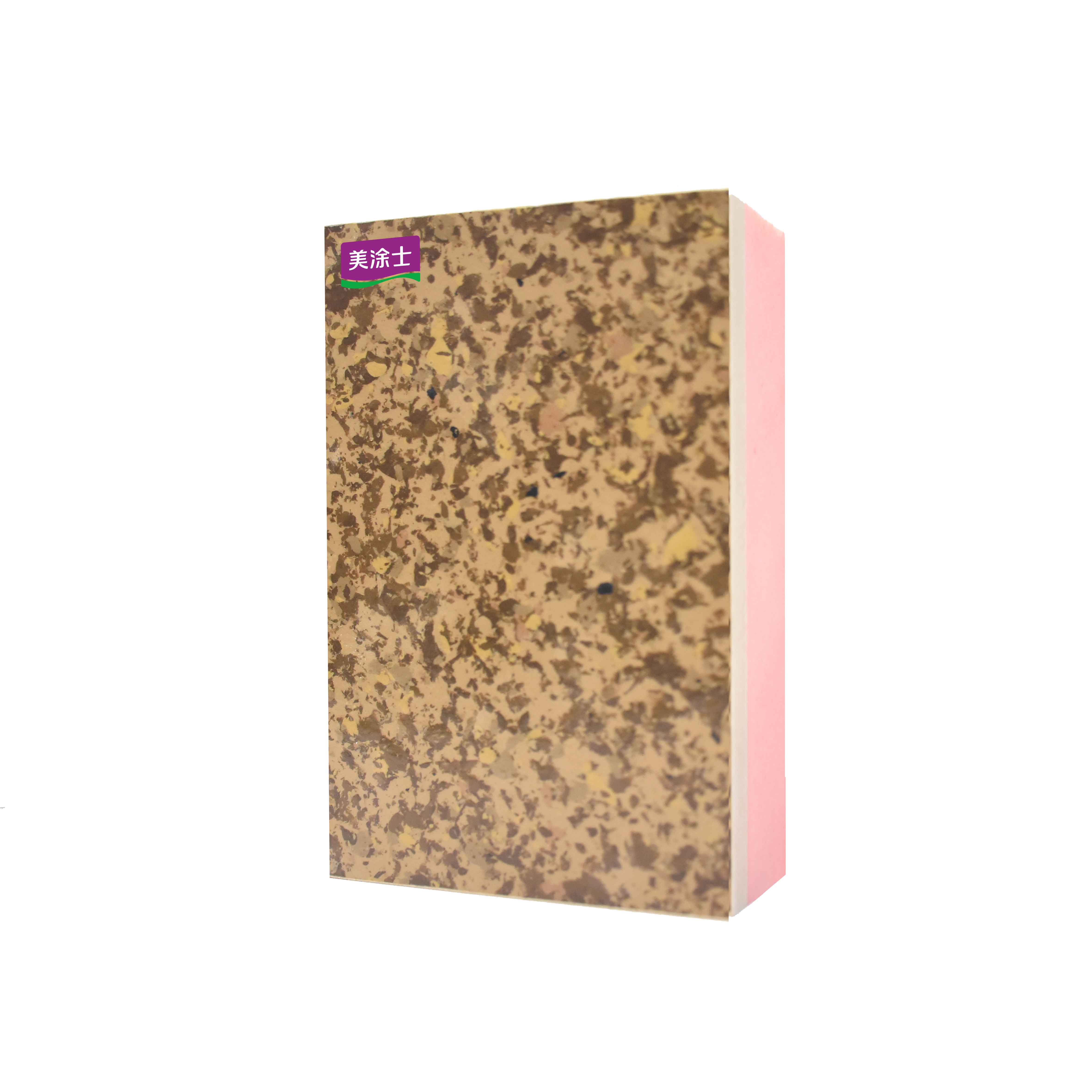 無機(jī)板類保溫裝飾一體板選用高密度、高強(qiáng)度A1級(jí)無機(jī)板為基材,通過精砂、滲透封閉、界面處理、飾面噴涂(輥涂)、固化、養(yǎng)護(hù)、復(fù)合等多道現(xiàn)代化生產(chǎn)工序加工成型。 美涂士仿石類保溫裝飾一體板飾面是采用多彩仿石涂料、通過全水性化噴涂技術(shù)使基板表面達(dá)到高仿真度的色彩紋理表現(xiàn),給人以天然大理石、花崗巖的逼真視覺感受,將人們對(duì)建筑物石材裝飾效果的鐘愛通過更經(jīng)濟(jì)、更環(huán)保的方式展示出來。常見的仿石材飾面包括多彩仿石飾面、多彩毛面飾面、水包砂飾面。 基板可根據(jù)客戶需求定制其他厚度:6mm、10mm、12mm、15mm;保溫材料可根據(jù)項(xiàng)目設(shè)計(jì)需要進(jìn)行自由組合。