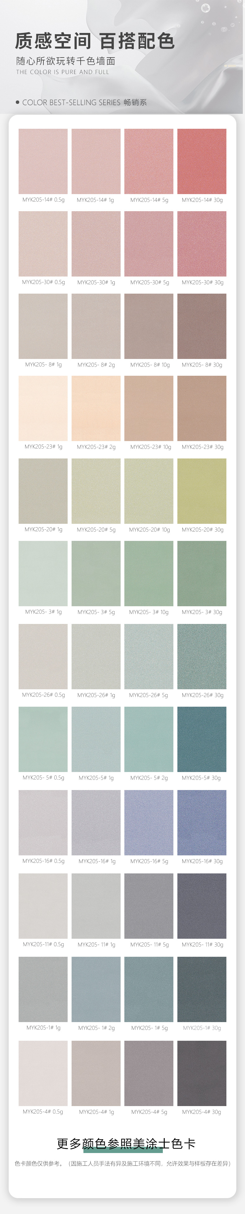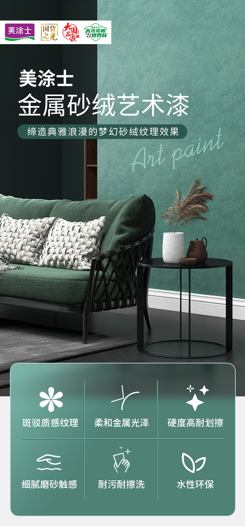 美涂士藝術(shù)漆,帶有金屬光澤和磨砂觸感效果,是砂與絨的完美質(zhì)感結(jié)合,紋理有序而又幻變,效果細(xì)膩而又典雅,打造出大氣與精致兼?zhèn)涞母呒?jí)格調(diào)!